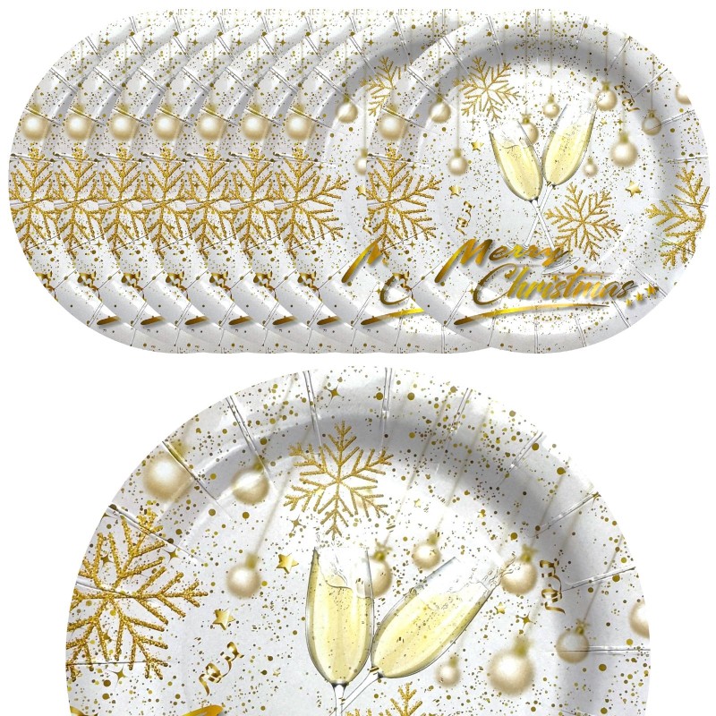 Świąteczne talerzyki Golden Cheers Christmas to eleganczny sposób na udekorowanie stołu podczas wigilijnego spotkania, firmowej kolacji lub domowego przyjęcia. Biały talerz zdobią złote śnieżynki, błyszczące akcenty oraz motyw dwóch kieliszków unoszących się w świątecznym blasku. Całość tworzy luksusowy, ciepły i celebracyjny charakter, który podkreśla magię wspólnego świętowani