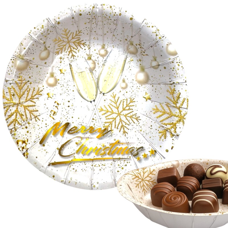 Wprowadź odrobinę elegancji na swoje świąteczne przyjęcie dzięki naszym papierowym talerzykom - miseczkom Golden Cheers Christmas. Biało-złota kolorystyka z motywem śnieżynek i kieliszków sprawia, że są idealne na każdą uroczystość, od bożonarodzeniowej kolacji po sylwestrowy toast.
