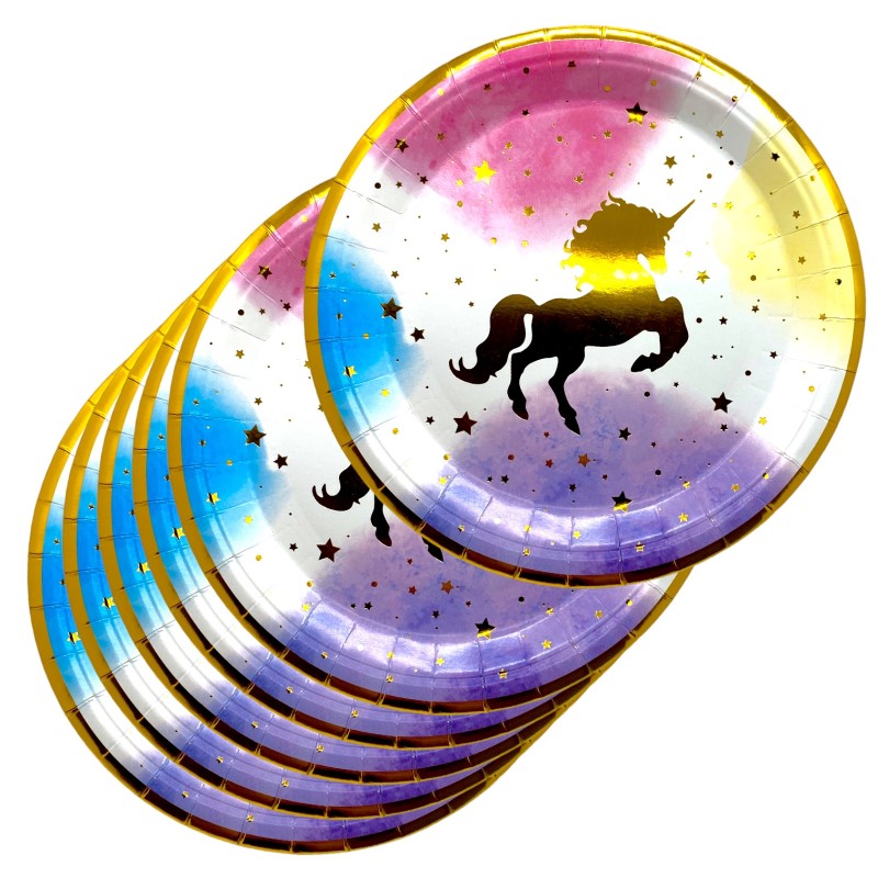 Prezentujemy zestaw 6 eleganckich papierowych talerzy z motywem jednorożca. Każdy talerz ma średnicę 18 cm, co czyni je idealnym wyborem na urodziny, baby shower czy inne magiczne okazje. Ich pastelowa kolorystyka z subtelnymi złotymi akcentami wprowadzi wyjątkowy nastrój.