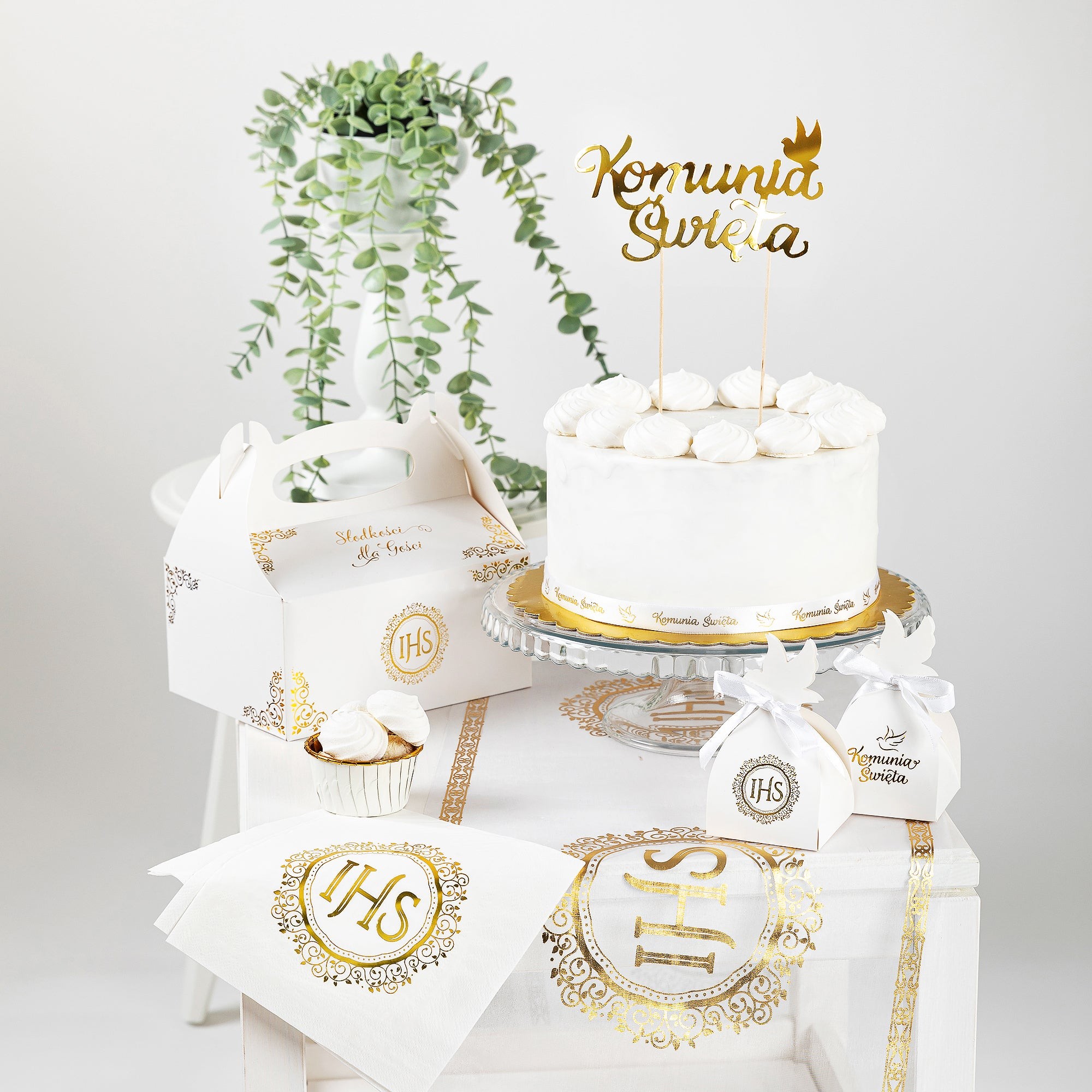 Elegancki złoty topper na tort komunijny z napisem „Komunia Święta” i symbolem gołąbka. Idealny na uroczyste przyjęcie, dodaje elegancji i podkreśla wyjątkowość chwili.