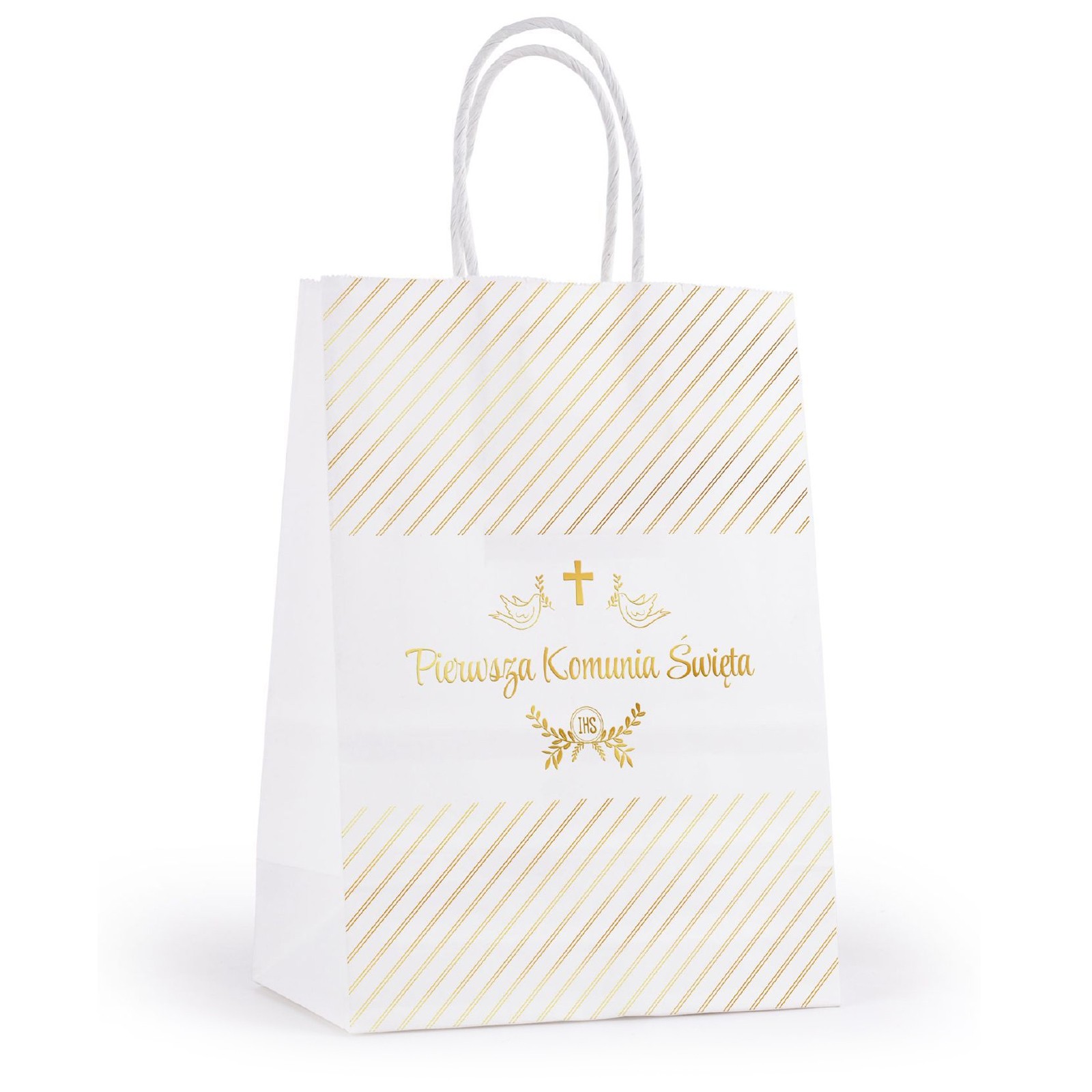 Papierowa torebka Pierwsza Komunia Święta 21x14,5cm biała ze złotym nadrukiem
