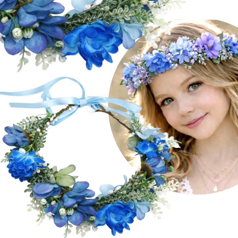 Romantyczny wianek boho w odcieniach niebieskiego i fioletu z zielonymi gałązkami. Lekki, regulowany wstążką, idealny do stroju wróżki, elfa lub Pani Wiosny, na sesje zdjęciowe, bale kostiumowe i przyjęcia w plenerze.