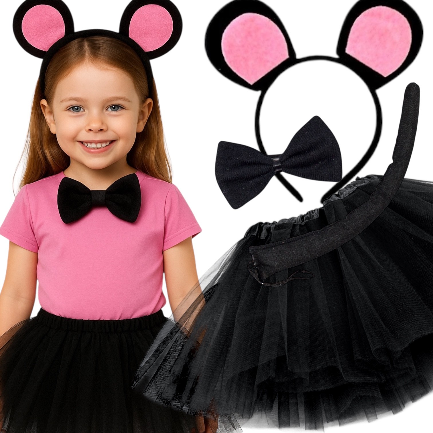 Śliczne i milutkie w dotyku akcesoria umożliwiające przemianę w myszkę:) Milutka opaska, muszka do zawiązania na szyi oraz ogonek z gumką do zamocowania na pasku / w pasie.