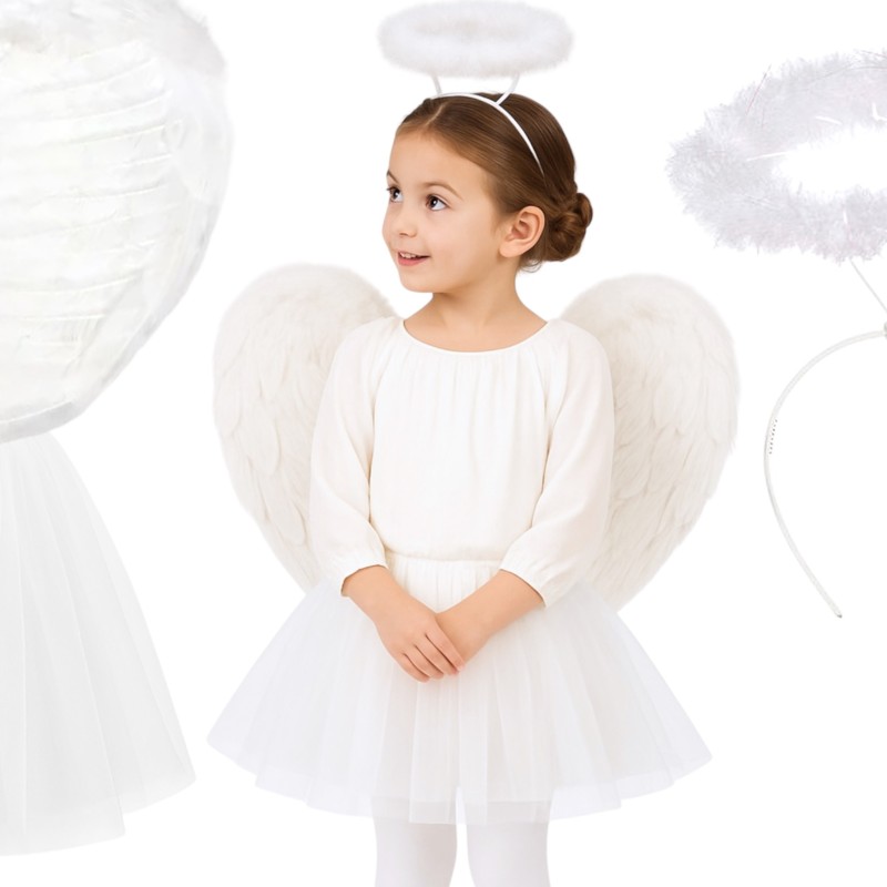 Przygotuj swoje dziecko na wyjątkowe chwile z naszym strojem aniołka. Zestaw składa się z trzech pięknych elementów: skrzydełek, tiulowej spódniczki oraz aureolki.