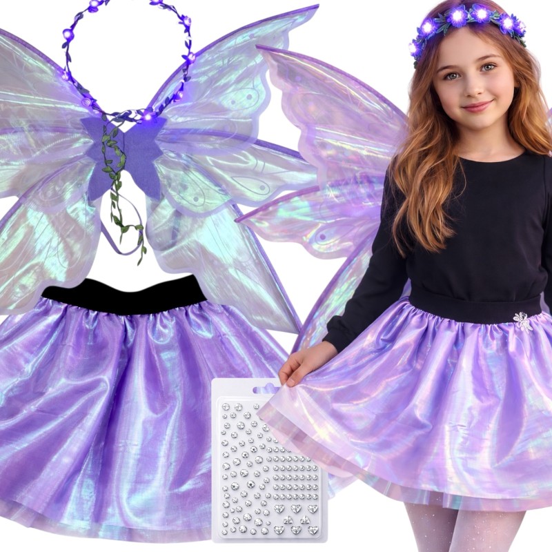 Zachwycający zestaw wróżki z holograficznymi skrzydłami, świecącym wiankiem LED i tiulową spódniczką satynową. Idealny na karnawał i inne okazje. Uniwersalny rozmiar dla dzieci w różnym wieku.