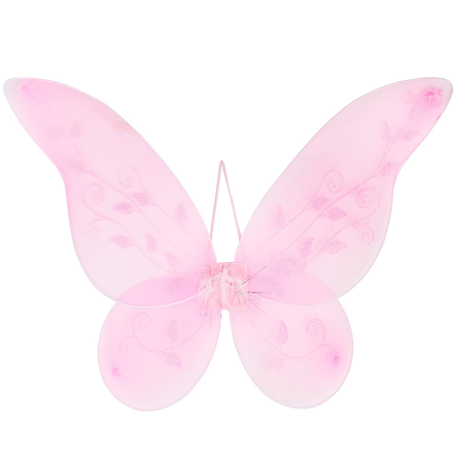 Duże, różowe skrzydełka o wymiarach 47 x 69 cm, ozdobione delikatnymi, połyskującymi wzorami, które dodają baśniowego uroku i lekkości.