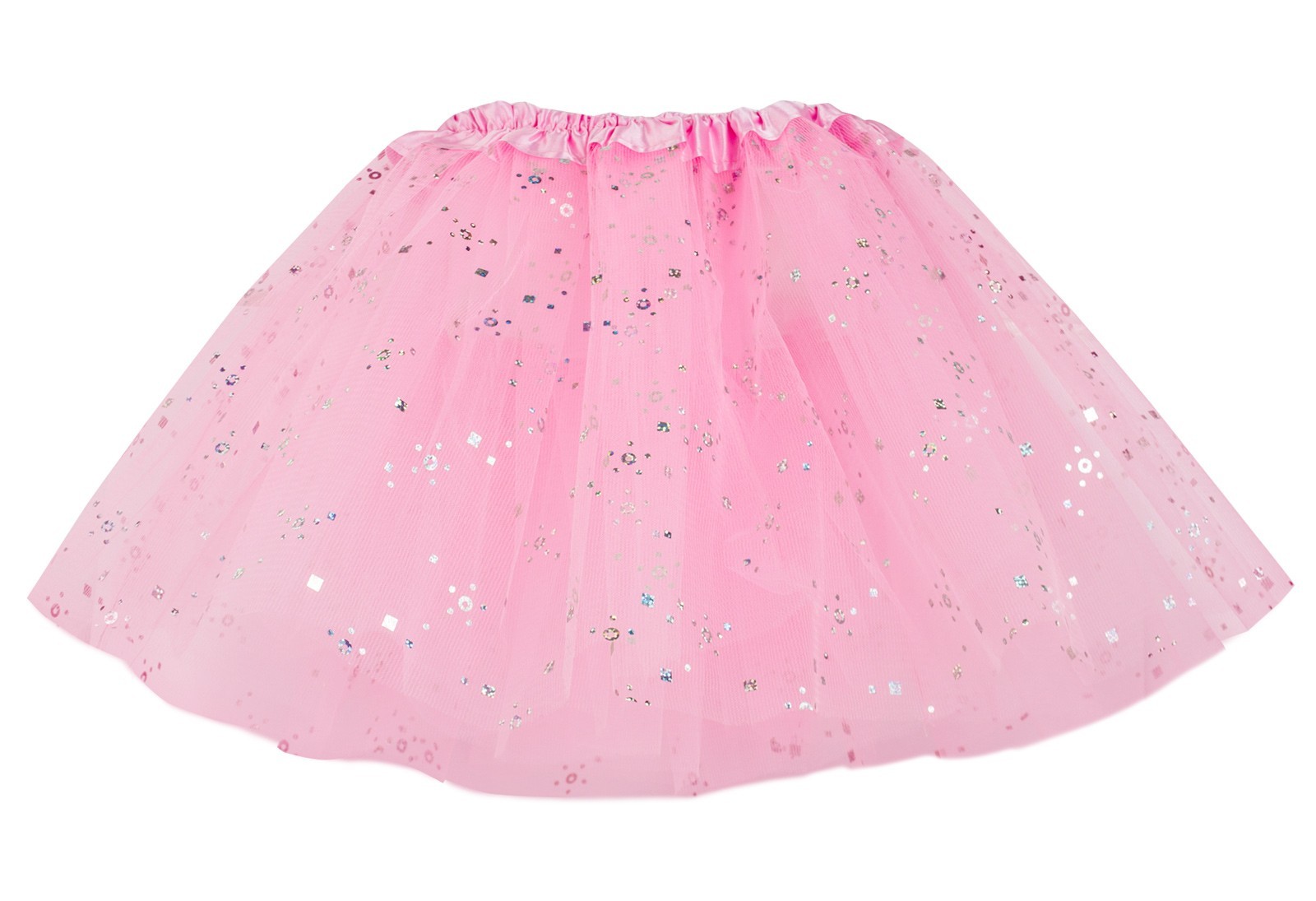 Spódniczka tutu o długości 30 cm, obsypana brokatem, która pięknie mieni się w świetle, doskonale komponując się z wróżkowym strojem. Gumka w pasie spódniczki jest bardzo elastyczna, co sprawia, że kostium jest uniwersalny i dopasuje się do różnych rozmiarów.