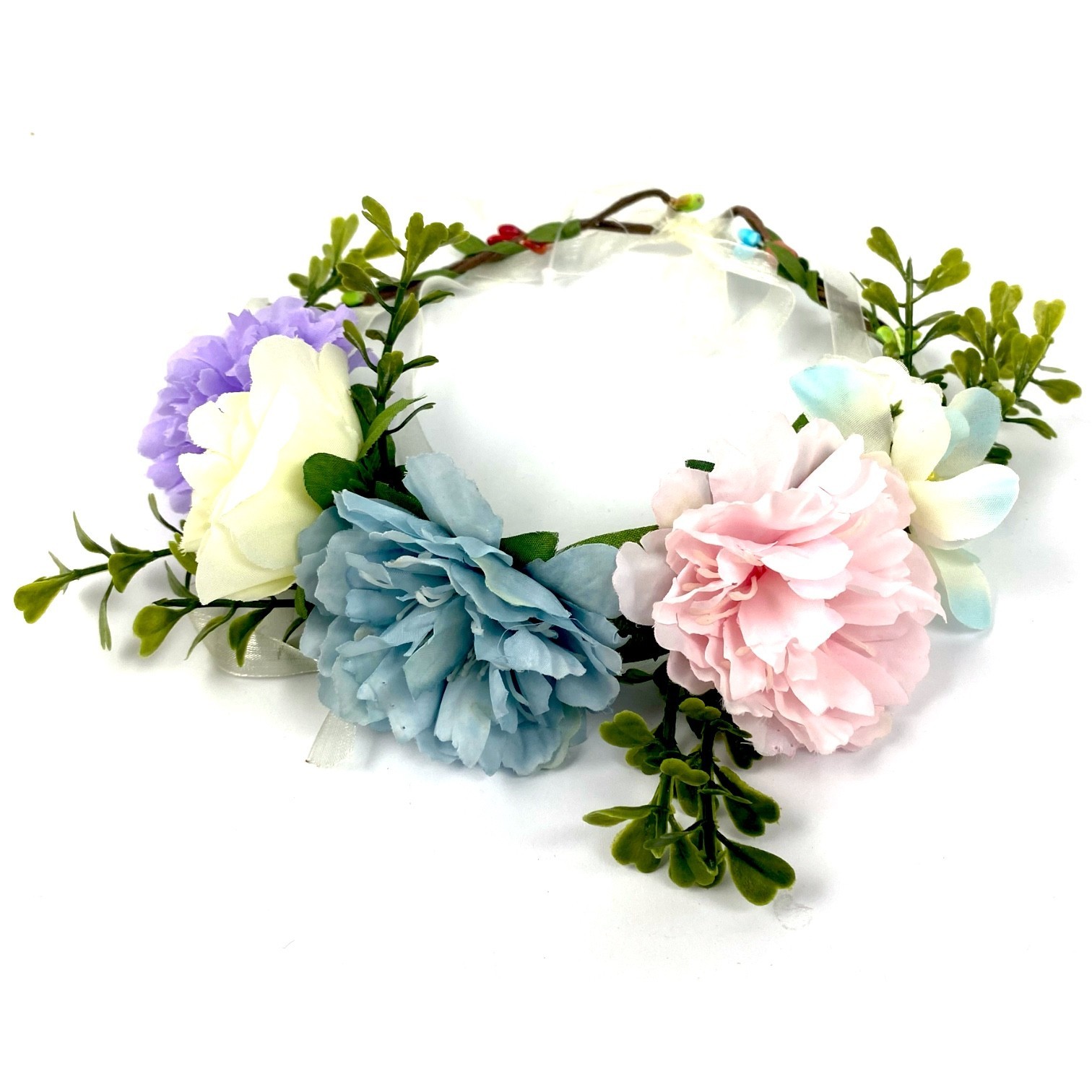 Kwiatowa opaska na głowę, udekorowana pięknymi kwiatami, które dopełniają wróżkowy wygląd.