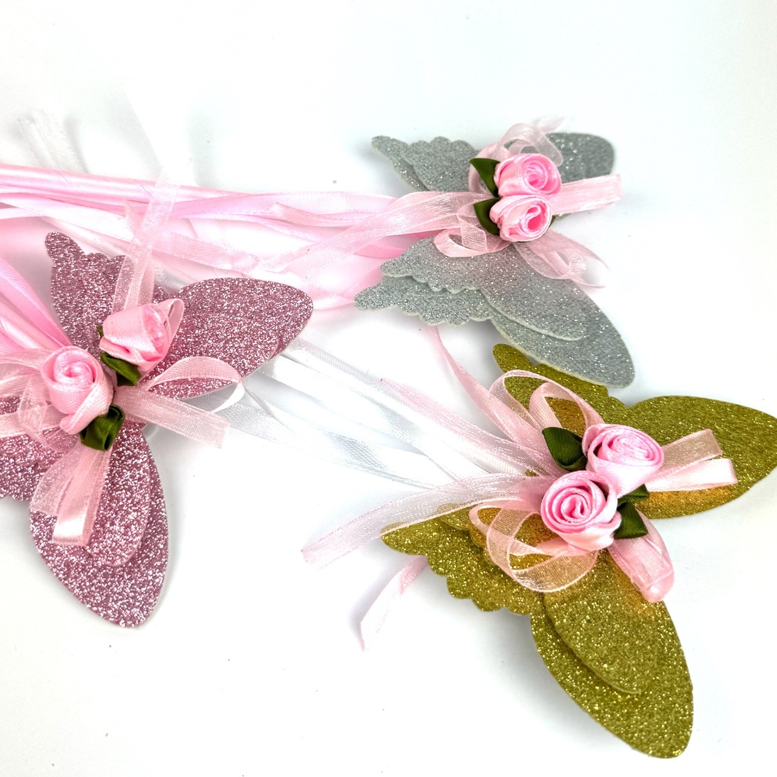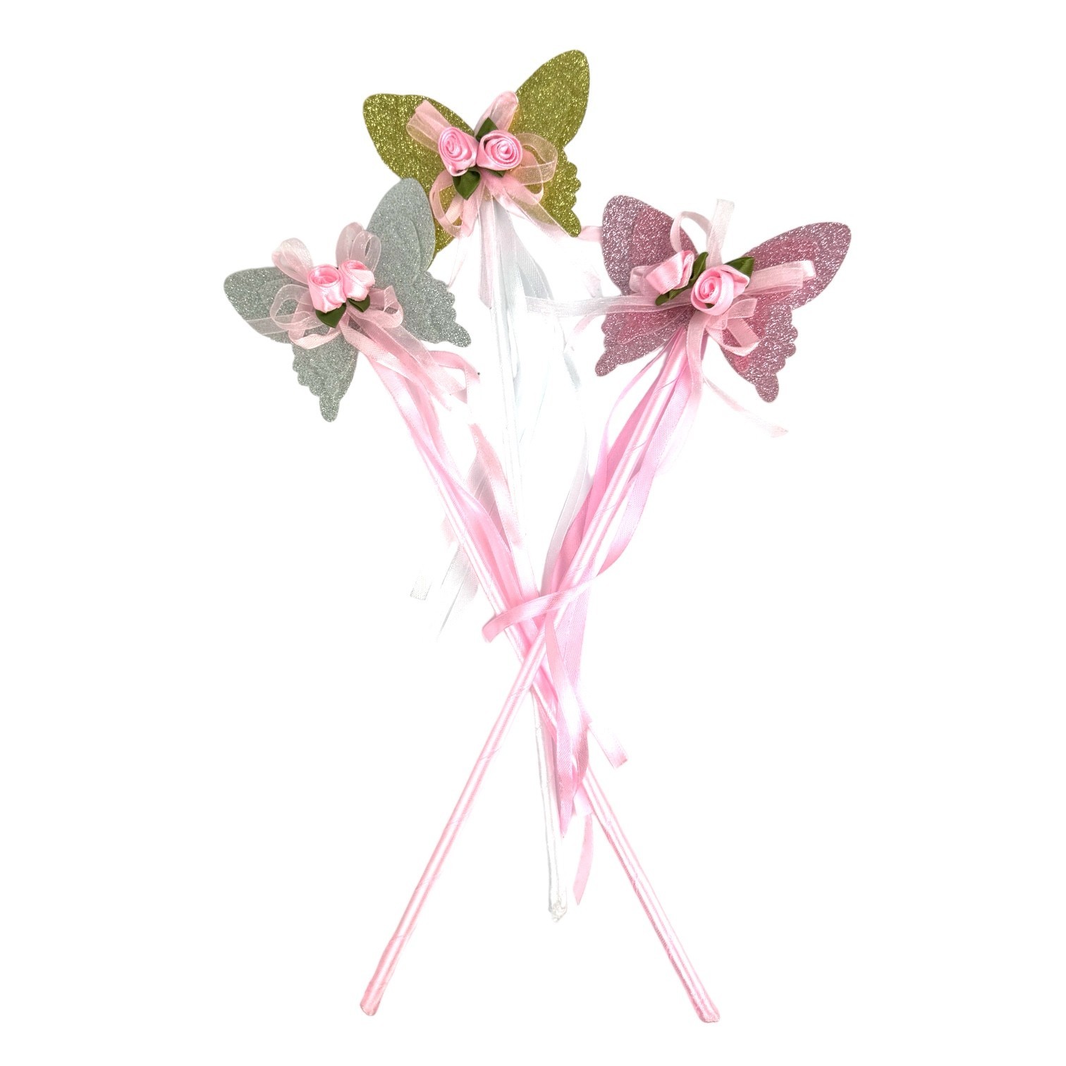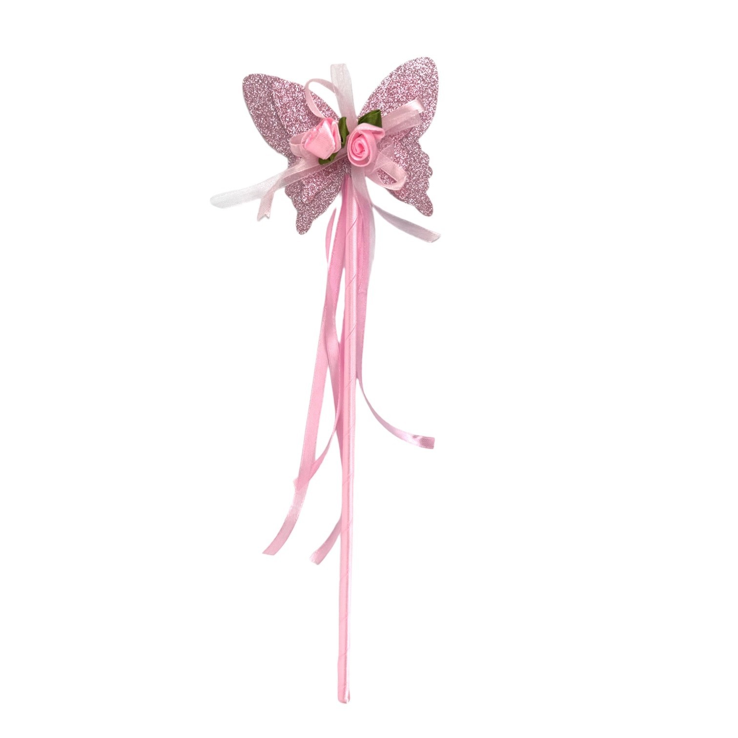Różdżka z motylkiem, ozdobiona różowymi wstążkami i kwiatkami, idealna do magicznych zabaw i rzucania zaklęć.