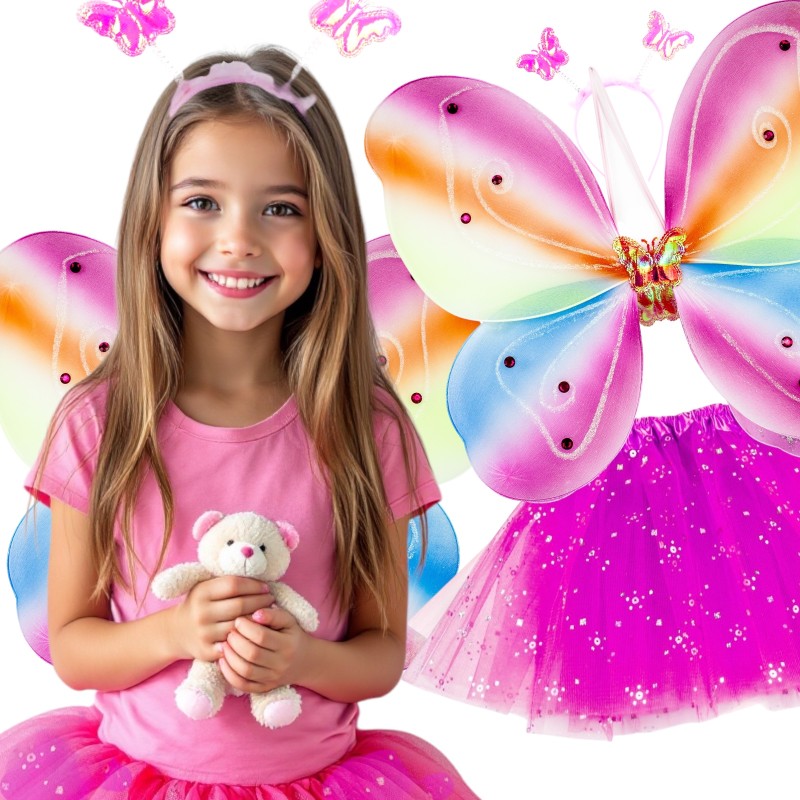 Odkryj magię z naszym strojem motylka! Zestaw zawiera delikatną tiulową spódniczkę, która jest lekka i zwiewna, idealna do zabawy i tańca. Skrzydła zdobione brokatem dodają blasku i elegancji, a ich wymiary to 46 cm szerokości i 39 cm wysokości. Uniwersalny rozmiar spódniczki z elastyczną gumką w pasie (20-49 cm x2) zapewnia wygodę noszenia. Całości dopełnia opaska z motylkami oraz różdżka do spełniania marzeń.