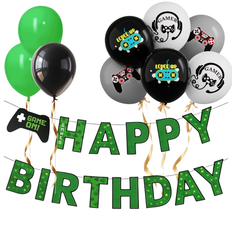 Zestaw dekoracji urodzinowych z gamingowym motywem. Zawiera girlandę z napisem 'Happy Birthday' oraz 9 balonów lateksowych w kolorystyce nawiązującej do gier. Idealne na przyjęcie fana gier.