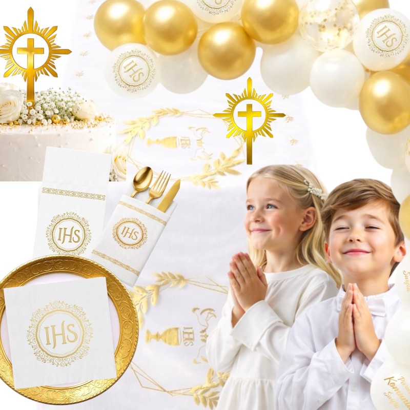 Kompletny, elegancki zestaw w biało złotej kolorystyce, który pozwoli szybko przygotować spójny wystrój stołu i przestrzeni na przyjęcie komunijne. Delikatne motywy IHS, kielicha i krzyża podkreślają uroczysty charakter dnia.
