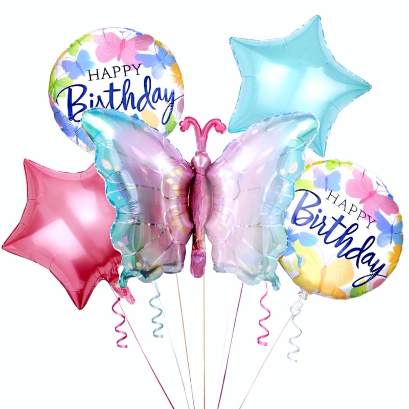 Pastelowy zestaw balonów foliowych, który od razu tworzy urodzinową scenę. W komplecie znajdziesz duży balon w kształcie motyla oraz cztery balony uzupełniające: dwa okrągłe z napisem "Happy Birthday" i motywem kolorowych motyli, oraz dwie gwiazdy w modnych, błyszczących kolorach.