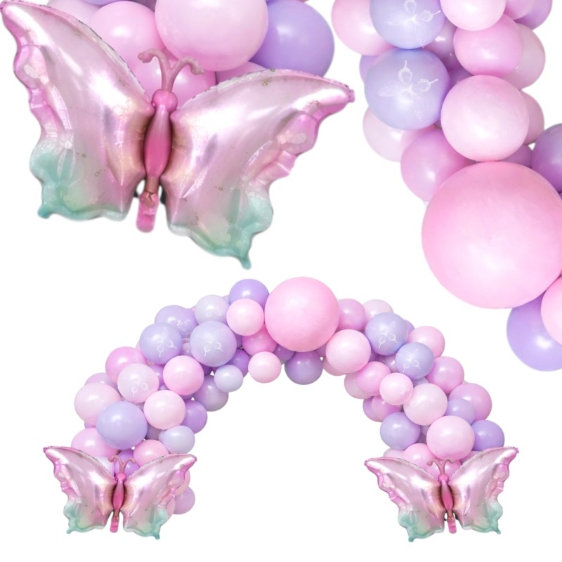 Pastelowy zestaw balonów Motylek GIRL Pastel Butterfly. Stwórz delikatną girlandę w odcieniach różu i lawendy z dwoma dużymi motylami foliowymi. Idealna dekoracja na urodziny, baby shower i sesje zdjęciowe.