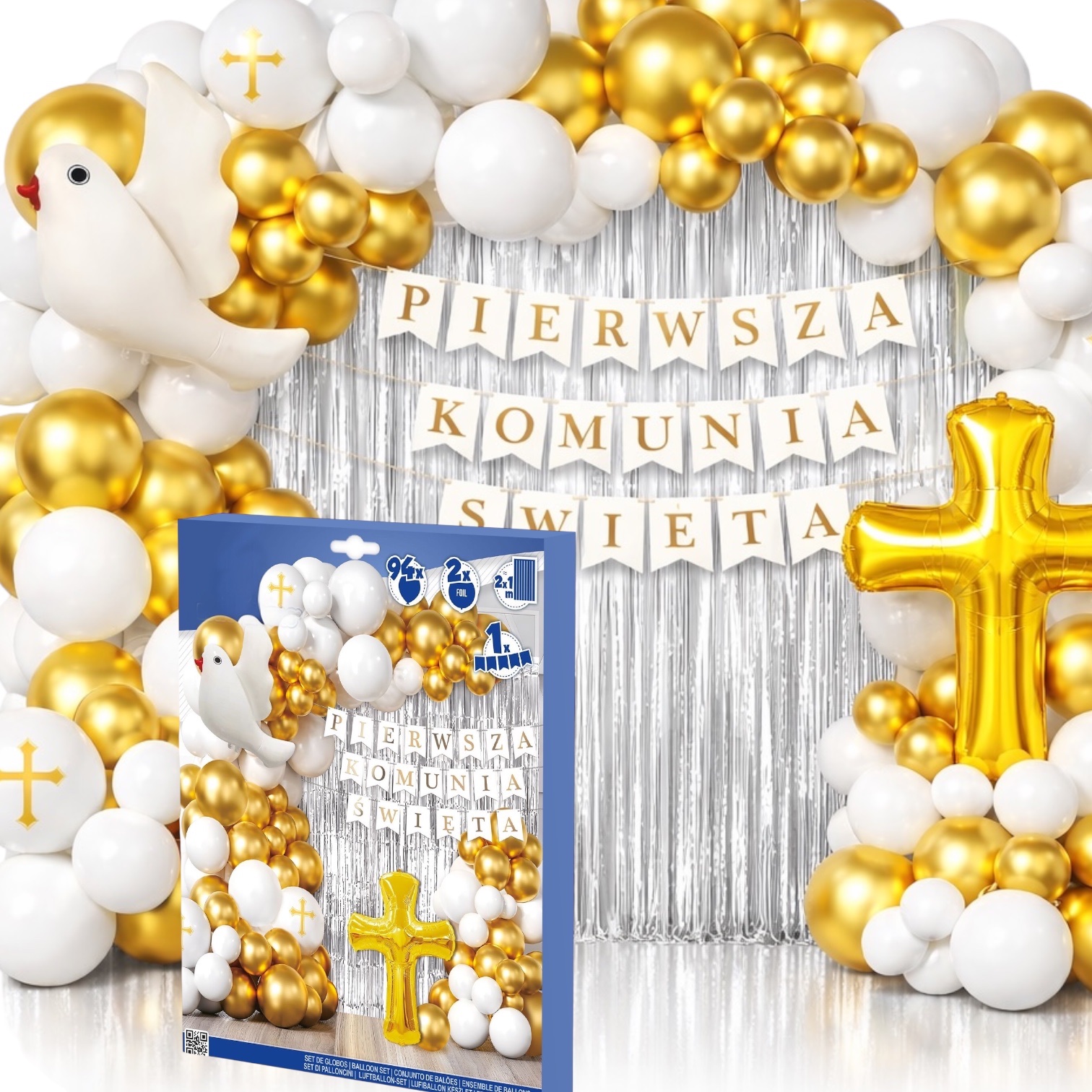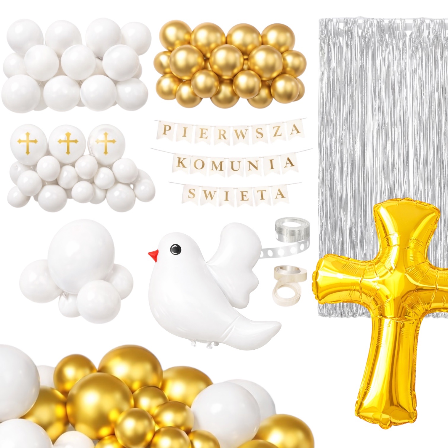 W zestawie znajduje się 94 elementy, w tym balony lateksowe, balony foliowe w kształcie krzyża i gołębia oraz srebrna kurtyna, która doda blasku całej dekoracji.