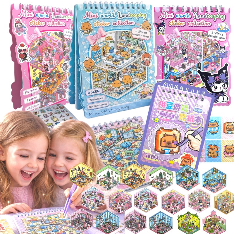 Kolorowy zestaw kreatywny z mini notesami scenek i naklejkami mozaikowymi. Dziecko tworzy własne domki, pokoje i miasteczka w stylu kawaii, ćwicząc wyobraźnię, spostrzegawczość i małą motorykę. Idealny na prezent i podróż.