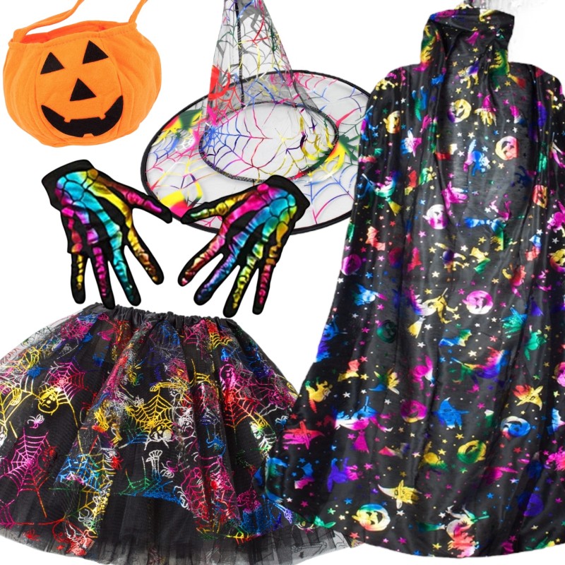 Zestaw Wiedźma dla dzieci 5-11 lat. W składzie peleryna, spódniczka tutu, kapelusz, rękawiczki i koszyk dynia. Idealny na Halloween.