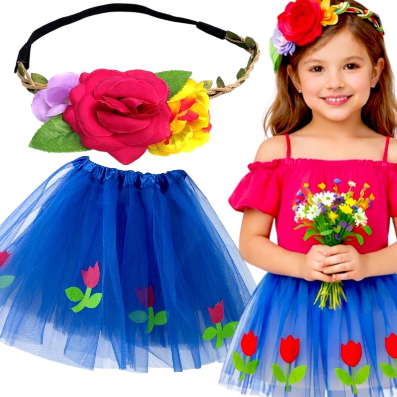 Dwuelementowy strój Pani Wiosna dla dziewczynki: lekka spódniczka tiulowa tutu z kolorowymi tulipanami oraz opaska–wianek z kwiatami. Idealny na bal przebierańców, przywitanie wiosny, akademie szkolne i rodzinne uroczystości.
