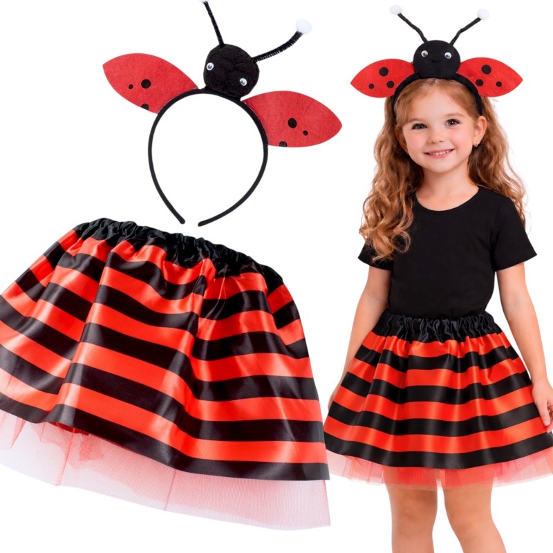 Dwuczęściowy strój biedronki dla dzieci: spódniczka z satyny i tiulu oraz opaska z buźką, skrzydełkami i czułkami. Uniwersalny rozmiar na wiek ok. 3–8 lat. Idealny na bal karnawałowy, przedstawienia i tematyczne przyjęcia.