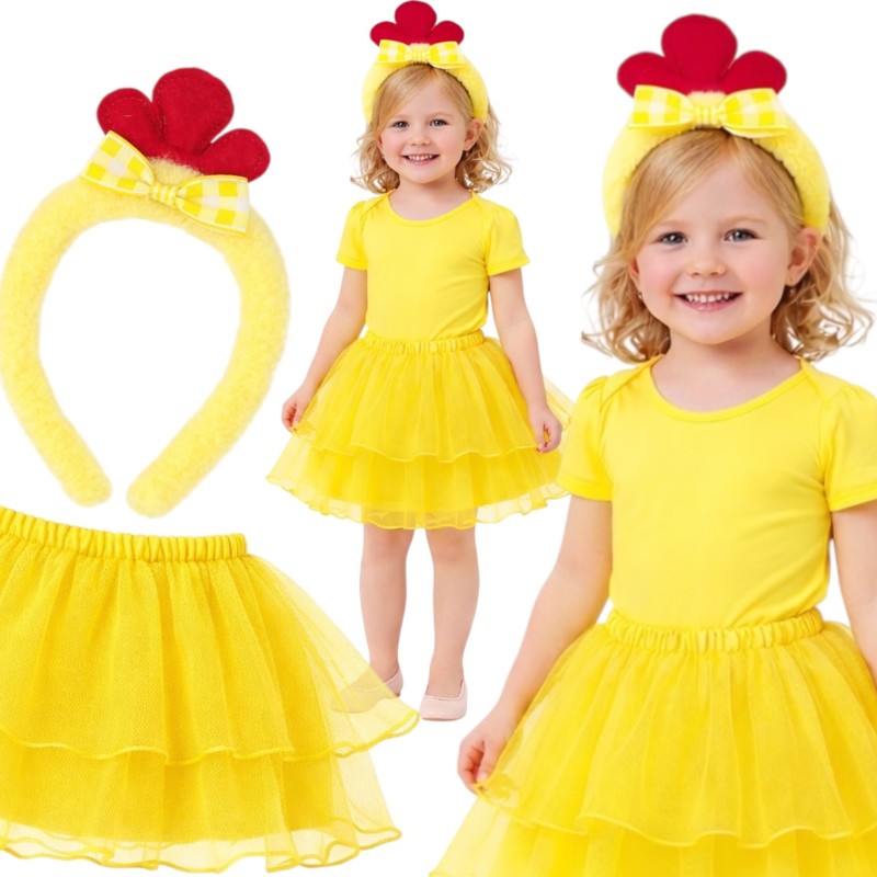 Dwuelementowy strój kurczaka dla dziewczynki: miękka opaska z grzebykiem oraz żółta tiulowa spódniczka z satynową podszewką. Uniwersalny rozmiar rośnie z dzieckiem, idealny na Wielkanoc, występy i przebierane przyjęcia.